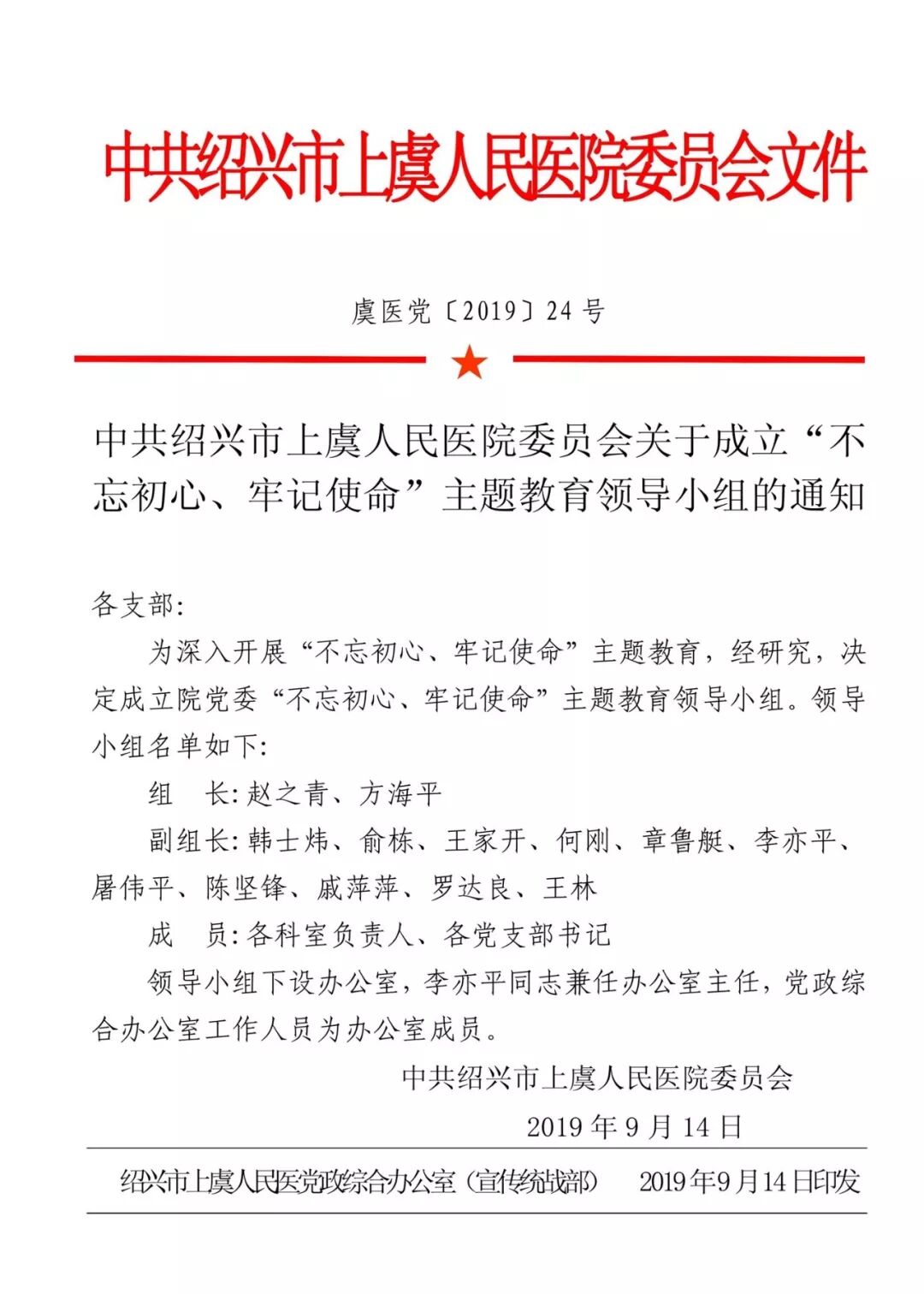 今年9月,根据上虞区卫生健康局关于“不忘初心、牢记使命”主题教育总体要求,院党委积极行动,认真谋划,按照“守初心、担使命,找差距、抓落实”的总要求,扎实推进主题教育;同时,结合医院工作实际,把学习教育、调查研究、检视问题、整改落实贯穿主题教育全过程,真正将医者初心融入到为人民谋健康的卫生事业中,取得了阶段性成效。