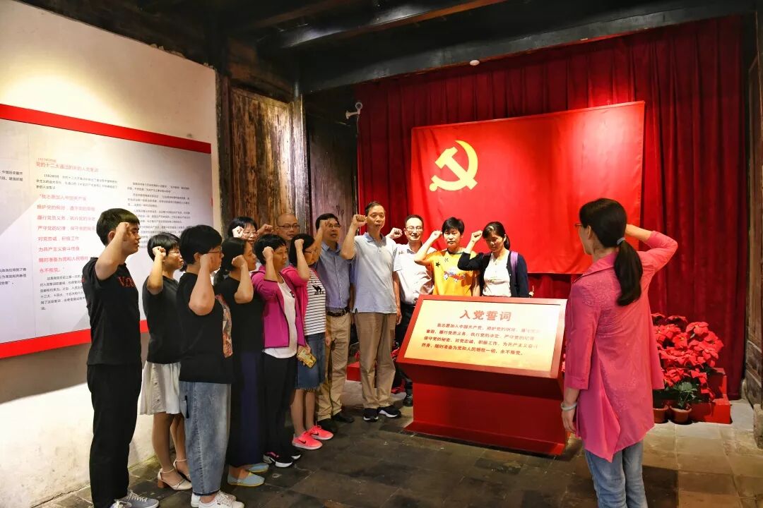 在纪念馆内的鲜红党旗下,大家重温入党誓词,举起右手,再次向党旗庄严宣誓。