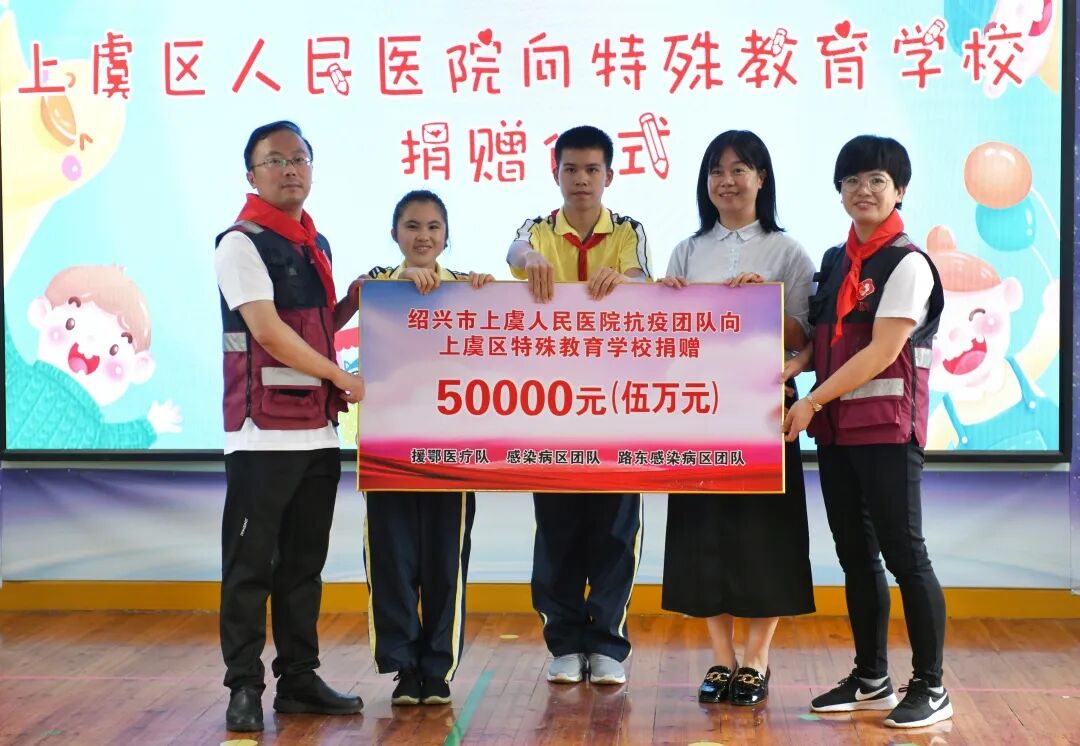 在随后举行的爱心捐赠仪式上,我院把此前社会各界在防疫期间捐赠给援鄂医护人员和医院的5万元爱心款转赠给上虞区特殊教育学校。七位援鄂医护人员更是与小朋友面对面分享“最美逆行”故事,陪伴他们一起度过了一个难忘的“六一”儿童节。